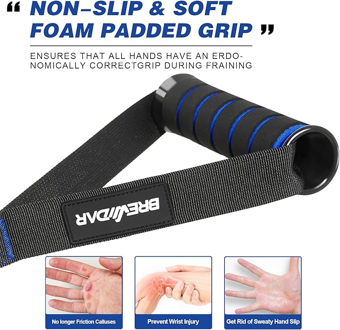 - PREMIUM QUALITY MATERIALS - Our gym exercise handles are designed to conform to the natural structure of your hand, ensuring ultimate comfort and grip. The extra-wide design offers ample space for your hands. The handle surface is wrapped with foam material for easy sweat absorption and to prevent hand calluses. The thick woven nylon webbing and heavy-duty stitching enhance durability and add a luxurious touch.