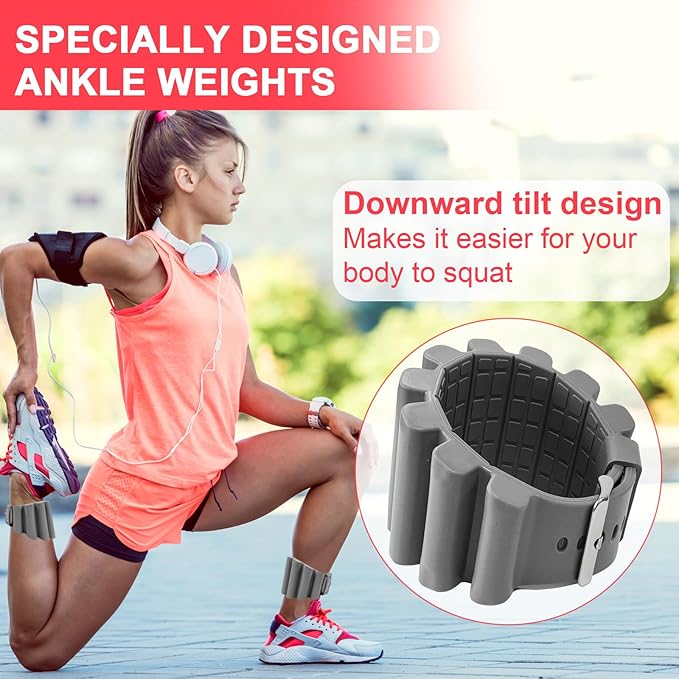 - [2LBS WRIST WEIGHTS SET of 2] The weight of each wrist weighted bracelet is 1 pound. The wrist weights are easily adjustable, with different buckle holes to accommodate your wrist/ankle or arm/leg size. The downward tilt design makes it easier for your body to squat. Whether you're looking to enhance strength training or improve aerobic performance, our adjustable wrist and ankle weights add comfortable resistance, making the weighted wristbands an essential kit for fitness workouts that can be used anytime, anywhere.