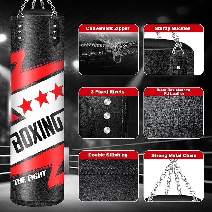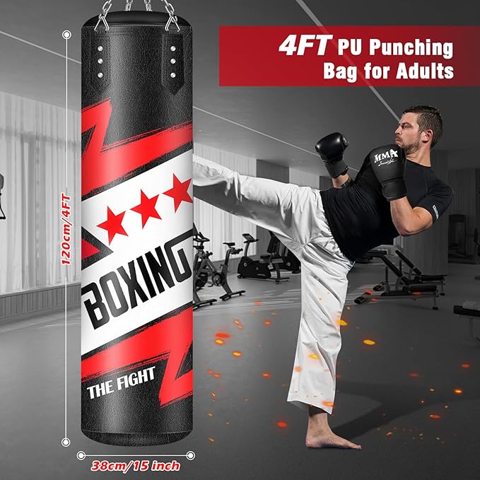 - Perfect Boxing Accessories Set: Our professional heavy punching bag set is perfect for boxing practice, includes 1 x 4FT unfilled punching bag for adults, 1 x 360° swivel hook, 1 x connecting carabiner, 4 x swivel stainless steel chains and 1 pair palm protector. Muay thai bag provides a full-body workout that helps you increase strength and power, build cardiovascular endurance, improve coordination, and reduce stress. Dimensions: 120cm/47.2‘’ long without chain, 35cm/13.8‘’ in diameter