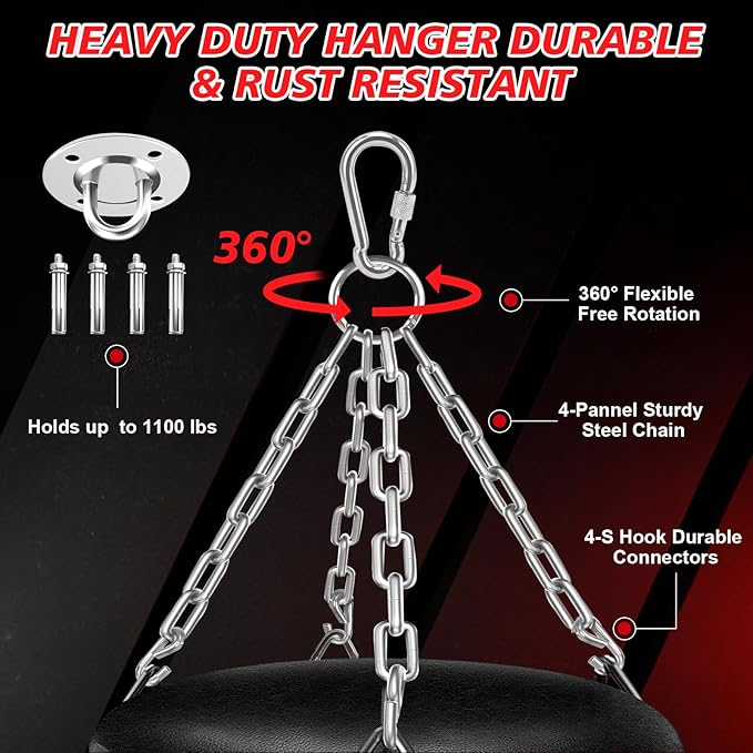 - 360° Swivel and Sturdy Hanger: Heavy duty metal chains and accessories are made of stainless steel, permanently rust-proof and safe. 360° rotating hook, flexible to hit, can rotate freely after impact, will not knot, easy to assemble, has strong load-bearing capacity, fully guaranteeing your safety and stability during use. Built to withstand the most powerful attacks in your home or commercial gym