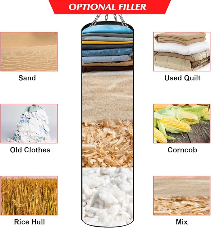 - Easy to Fill: Heavy bag comes unfilled, foldable, easy to carry and store. It can be filled through the zipper seal on the top of the punching bags, you can pack anything you want, such as old clothes, rags, quilts, pillows, sand, corn, sawdust, foam, sponges and cotton, etc, further reducing impact force and providing better protection. Control the weight to suit your preference. But please don't just fill with sands, the fill should preferably not exceed 80 pounds