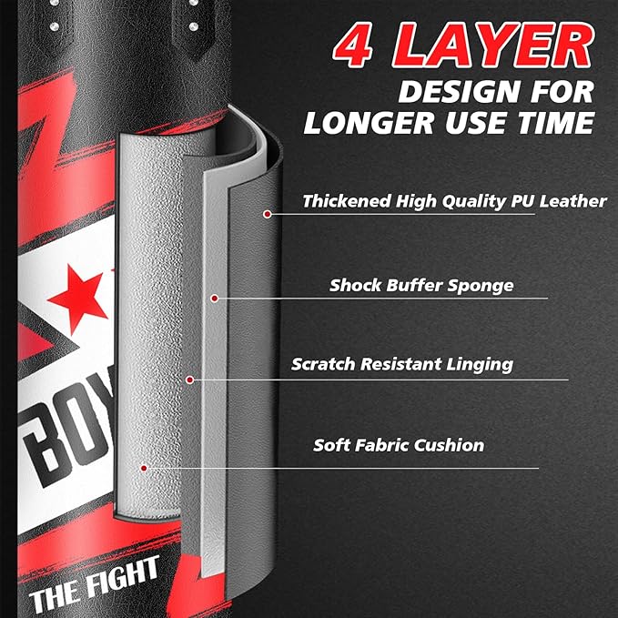 - Premium PU Leather: The boxing bags are made of high-quality microfiber PU leather, with a multi-layer structure and shock-absorbing foam padding design, which effectively reduces the impact generated during boxing and protects wrists and joints. Tear-resistant, wear-resistant, quick rebound, reinforced stitching can be used for a long time, providing a good boxing experience.Palm support provides excellent comfort and hand protection, Reduce the chance of wrist injury