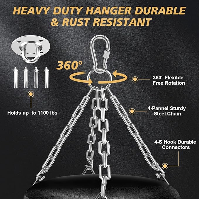 - 360° Swivel and Sturdy Hanger: Heavy duty metal chains and accessories are made of stainless steel, permanently rust-proof and safe. 360° rotating hook, flexible to hit, can rotate freely after impact, will not knot, easy to assemble, has strong load-bearing capacity, fully guaranteeing your safety and stability during use. Built to withstand the most powerful attacks in your home or commercial gym