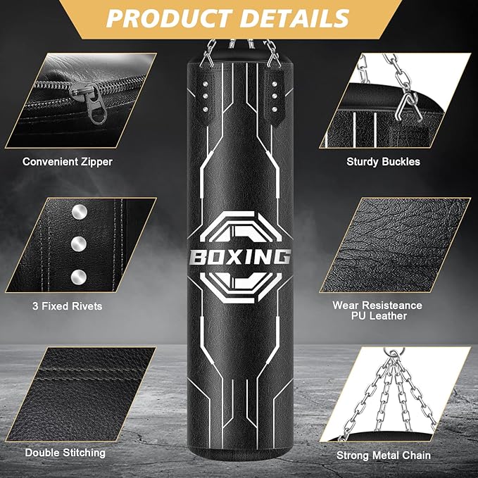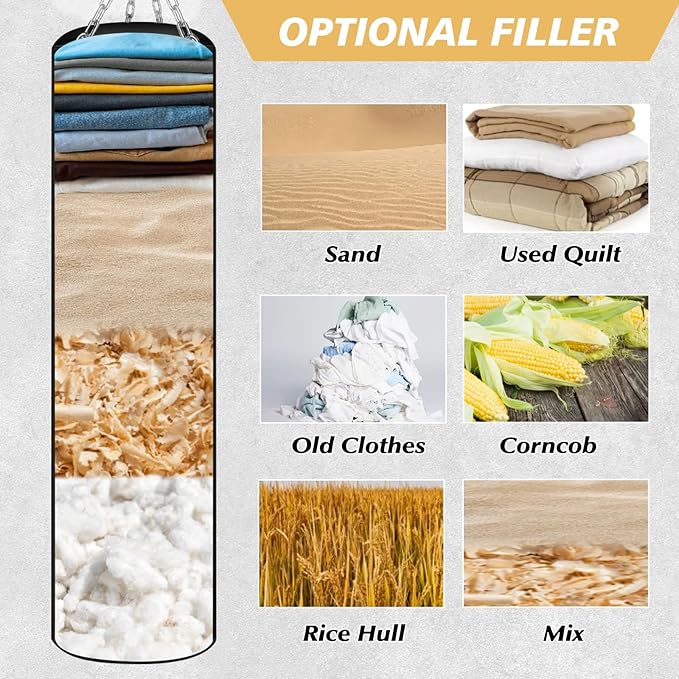 - Easy to Fill: Heavy bag comes unfilled, foldable, easy to carry and store. It can be filled through the zipper seal on the top of the punching bags, you can pack anything you want, such as old clothes, rags, quilts, pillows, sand, corn, sawdust, foam, sponges and cotton, etc, further reducing impact force and providing better protection. Control the weight to suit your preference. But please don't just fill with sands, the fill should preferably not exceed 80 pounds