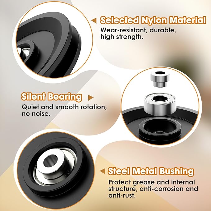 • Wide Application: Nylon bearing pulleys as replacement parts for most fitness equipment, home gyms, cable machines, lat pull down cable machine systems, weight pulley system, power racks, garage doors, pulley pullers, clotheslines, DIY home projects, etc.
