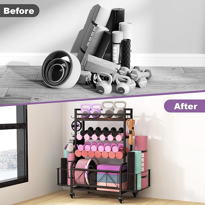 - Large Fitness Equipment Organizer: This multifunctional weight rack for home gym comes with a top shelf for kettlebells, 2 tiers of adjustable width dumbbell racks, 2 side baskets for yoga mats and foam shafts, 2 sets of rows of hooks for fitness resistance bands and rollers, 2 movable hooks, and a bottom storage shelf that is perfect for storing balls, yoga blocks, and other fitness equipment. The dumbbell rack is perfect for organizing and storing each do fitness equipment together, easy to save space and stay organized, weight rack your fitness equipment storage place more beautiful.