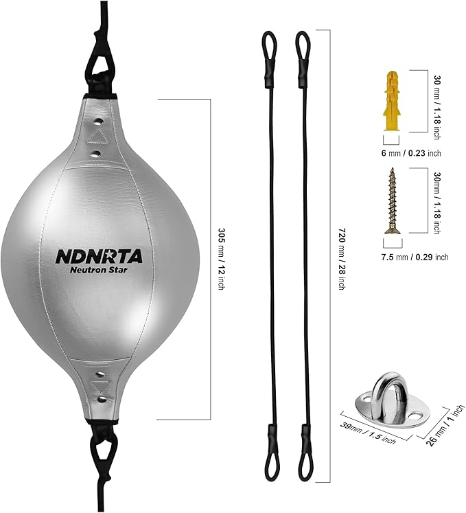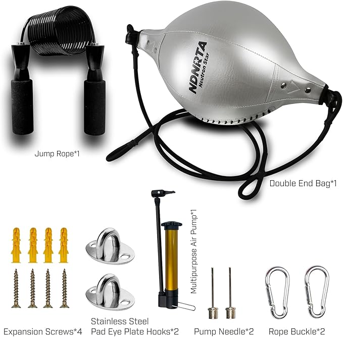 - [Upgraded Double End Punching Bags] All new NDNRTA professional punching bag to improve reaction speed for boxing, MMA, Muay Thai and other punching training. It features convenient and safe design with super elastic rope and ring locks for quick installation in gym and home.