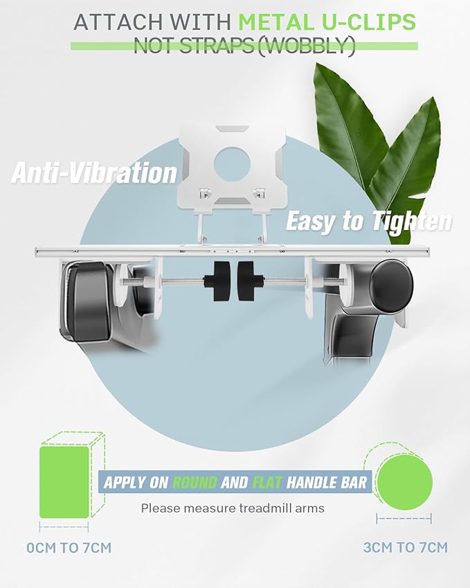 - An Unique Sturdiness Ensurance: Universal metal U-shape clips, apply on round (1.2"-2.75") and flat (0"-2.75") handlebar. An slim 2.36" cross bar maximizes the "useful area" between two treadmill arms. Just fold up the tray then ready for a no impedes running.