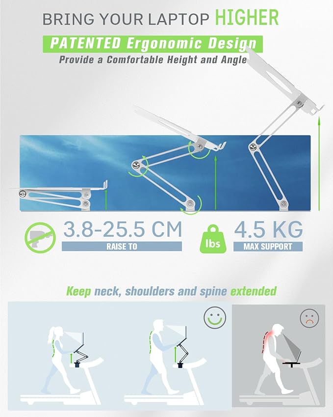 - Max Freedom for Walking Workstation: Adjustale height and angle for different working postures. INMAKER treadmill laptop holder keeps neck, shoulders and spine extended while on a online conference, mail writing or video watching etc.