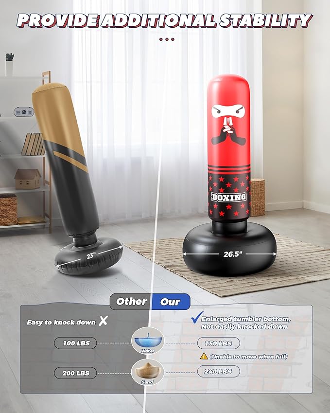 - Stability & Quick Rebound: 26.5" base, wider than most boxing bags on the market. Filling it with water or sand boosts stability by 200%. Reinforced waist structure enhances shock resistance, allowing for quick recovery even after intense strikes, simulating a true punching experience
