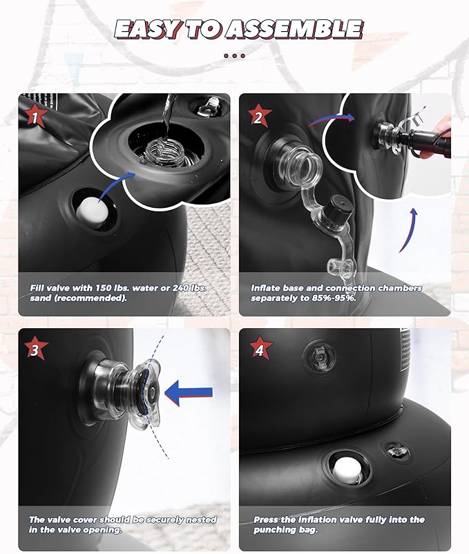 - Quick Setup in Minutes: Simply fill the base of the blow up kids punching bags with water or sand and inflate the two independent air chambers, and you can start practicing taekwondo or karate within minutes—convenient and fun