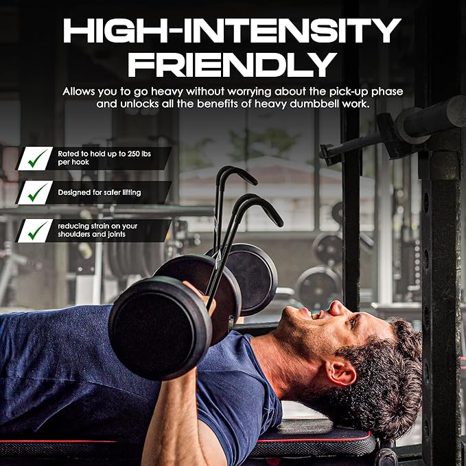 - Versatile & Convenient Design – Securely attach these dumbbell spotter hooks to your dumbbells and easily hang them onto any overhead barbell. Eliminate the hassle of lifting heavy dumbbells off the floor and reduce strain when lowering them after your workout.