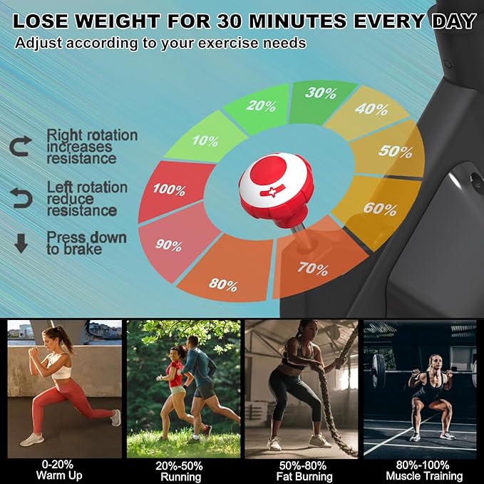 - 【SMOOTH STATIONARY BIKE】Configuring different resistance levels can bring you a realistic road feel. Different resistance levels can meet your different needs for exercise thus burning more calories. And the built-in push-down emergency brake can protect your safety in dangerous situations.Easy and quick to set up and take down, with an extremely space-saving design .Easily moveable with the front-mounted transport wheels of the spin bike.