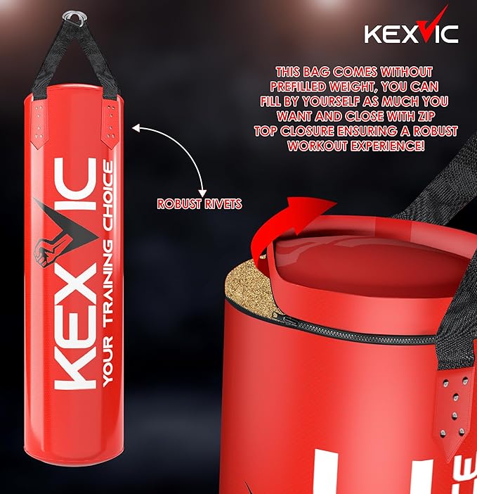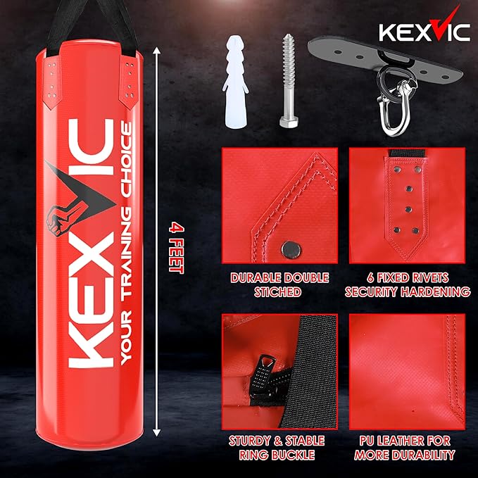 - Value Boxing Gear Accessories : This Boxing Set Includes 1 x 4FT Unfilled Hanging Punching bag, 1 x Pair of KEXVIC 12OZ Boxing Training Gloves, 1 x Pair of Hand Wraps, 1 x Jumping Skipping Rope, 1 x Hands Gripper, 1 x Ceiling Hook with Swivel and Hanging Straps for the Heavy Punching Bag