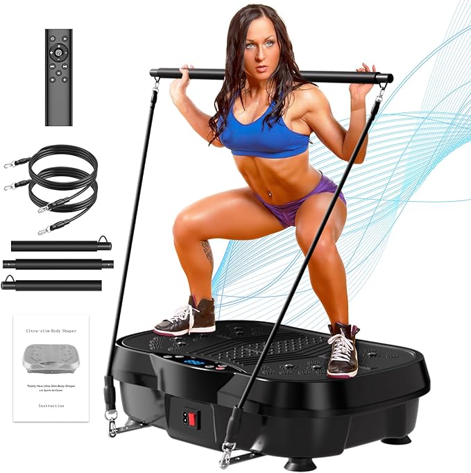 Vibration Plate Exercise Machine - Whole Body Workout Vibration Platform Machine for Lymphatic Drainage, Home Fitness & Weight Loss w/Pilates Bar + Resistance Bands + Remote