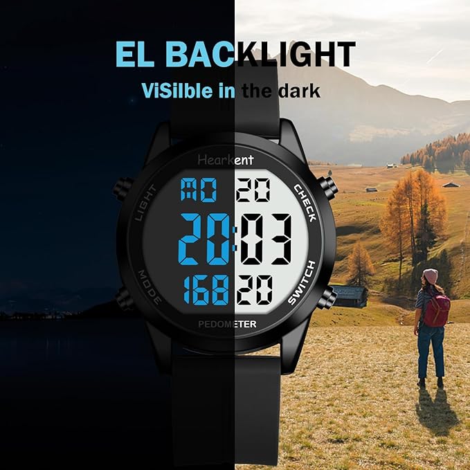 - Enhanced Visibility: Our pedometer watch boasts large numbers and a bright EL backlight. With just a glance, you can easily check the time or view your step count. Stay on top of your fitness goals at any time of the day or night