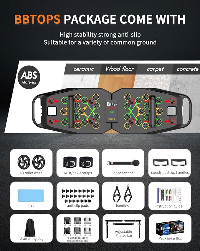- 【High Quality Push UP Board】The Bbtops push up board is made from durable ABS plastic, high durability and rigidity and outstanding resistance to impact, abrasion,and can be folded 180 degrees. Withstands weights up to 500 pounds of force.
