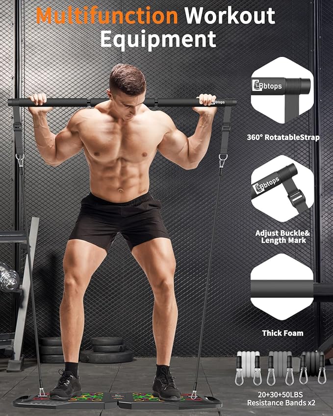 - 【Multi-functional Home Gym】all-round upper-body workouts, A more focused and effective push up training system is color-coded, strengthen and sculpt the upper body. The push-up board combined with resistance bands with bar, Pilates bar, and pulley offers various training positions,you can complete more than 50 different workouts.