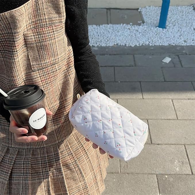 2 Pieces Portable Makeup Bag Travel Small Zipper Cosmetic Bags Organizer for Women Handbag Toiletry Storage Pouch Waterproof Quilting Purse,White Cherry