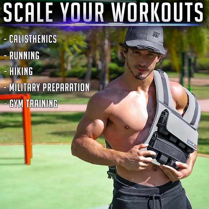 - WEIGHTED VEST - Includes 20 iron weights 10 in front and 10 in back for equal weight distribution. Each weight individually wieghs 2.2lb (1kg). Weight and fit are fully and comfortably ajustable for both men and women.