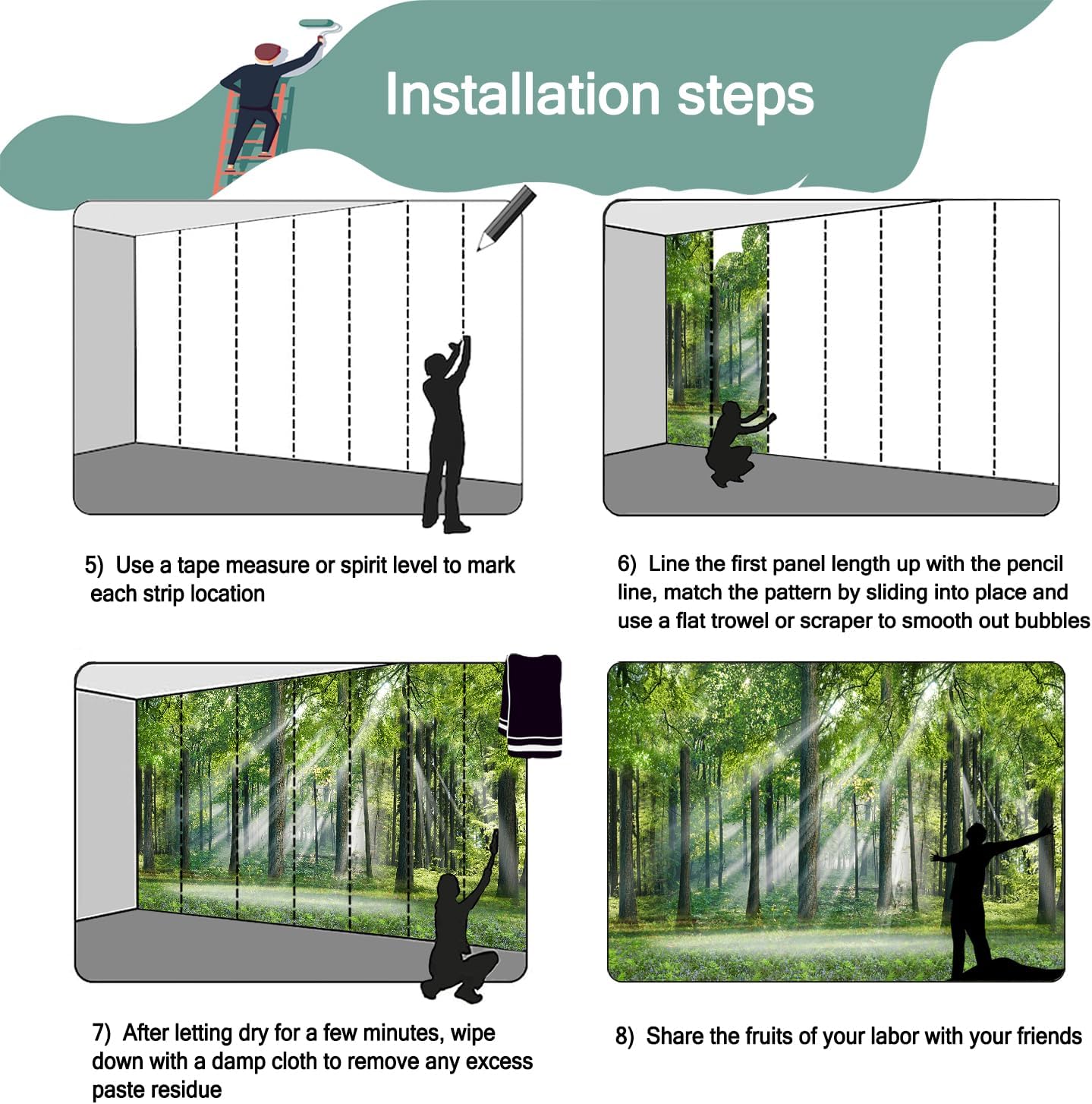 - Mural wallpaper size: 100 "W x 65 "H, divided into 5 sections, each section is labeled with a number underneath, there is no need to overlap the pattern when installing, just install according to the number labeled underneath the panel