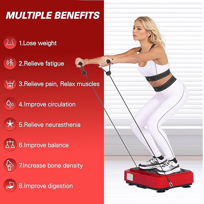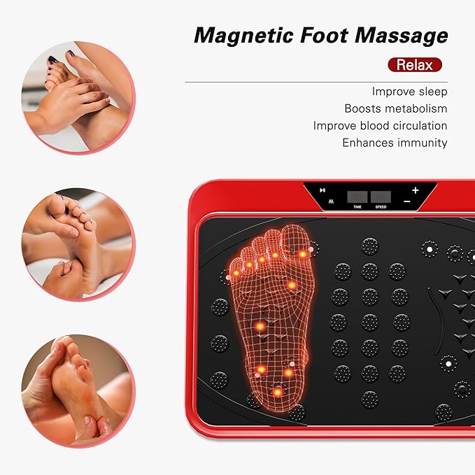 - 【Vibration plate with unique finger pressure surface】This full body vibration board exercise machine is equipped with a unique customized foot massage stone.When we use a weight loss vibration board,it can stimulate pressure points on our feet,massage our soles,and help relieve back pain,headaches,insomnia,poor blood circulation,muscle and joint pain,stress,and anxiety.