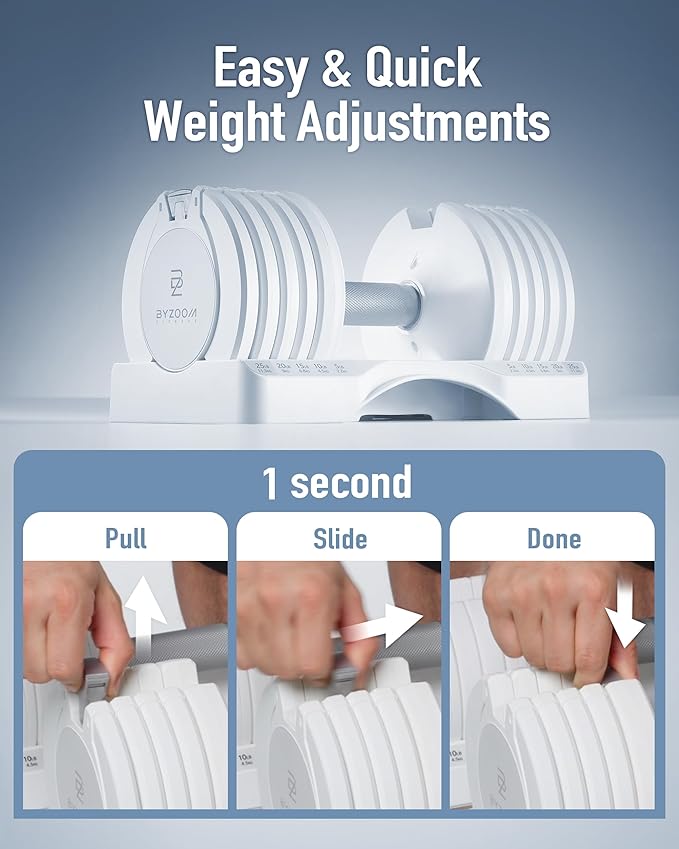 - Easy Weight Adjustments & Progress Tracking – Quickly adjust the dumbbells' weight with a simple slide using the patented mechanism, while the five resistance levels of the bands help you track your progress with stylish color coding.
