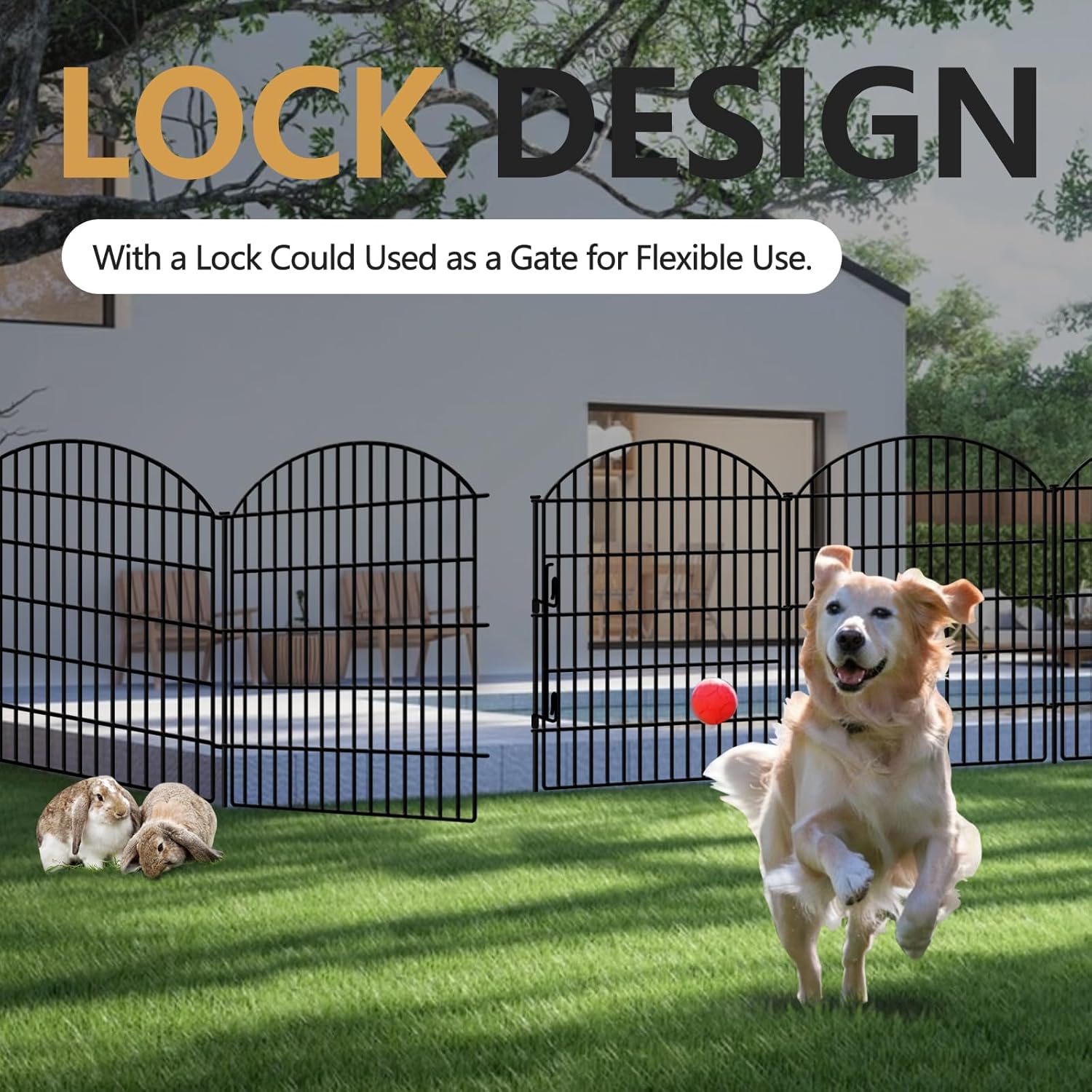 - EASY TO INSTALL: This garden fence are equipped with metal stakes and a lock. To install, simply insert the metal stake into the eyelet between the two fence panels to connect them. The lock is used as a gate, insert the stakes through the round holes and the lock holes, and the attach the hook of the lock to the left panel, pull the lock to open or close the gate. The fence is expandable, if you need to expand the fence, it can be easily done as well.