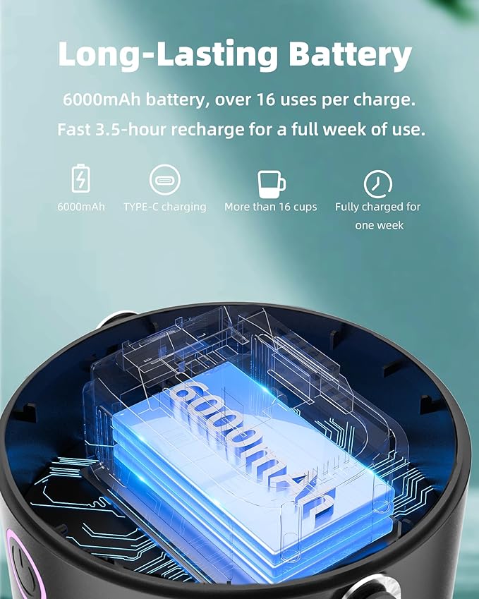 - 6000mAh High-Capacity Battery: The battery operated personal blender powered by a 6000mAh battery that supports over 16 blending cycles on a single charge. With TYPE-C 5V-2A fast charging, it fully charges in just 3.5 hours, offering an impressive week-long usage for active, on-the-go lifestyles.