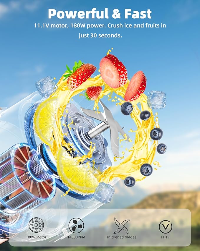 - 11.1V Powerful Motor & Precision Blades: The cordless small blender Equipped with an 11.1V high-torque copper motor delivering 180W of output, 14000 rmp. Reinforced cross-shaped stainless steel blades and a fluid-dynamic design maximize blending efficiency, effortlessly crushing fruits, ice, and tough ingredients in just 30 seconds.