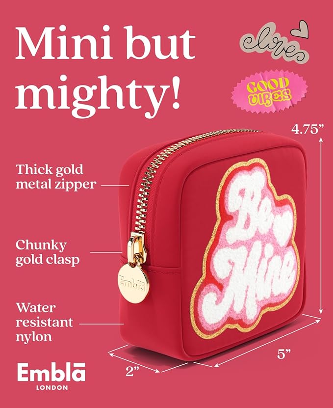 - GIVE THE GIFT OF LOVE AND FASHION with Embla’s new mini cosmetic pouches with chenille patches that express your affection including checkered hearts, XOXO, LOVE, and BE MINE. Ideal present for wife, girlfriend, mom, grandmother, daughter, bridesmaids, teachers, cheer teams, Valentine's Day, Mother's Day, Anniversaries, or Birthdays. Available in Flamingo Pink, White and Ruby Red.