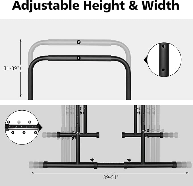 - 【Adjustable Height & Width】MIUDGIG adjustable parallel push up stand, width is 39''- 51'' inch, Height is 31''- 39'' inch. You can easily set up different workouts to do to maintain or improve health and fitness, you can adjust it To suit your needs for a variety of sports.
