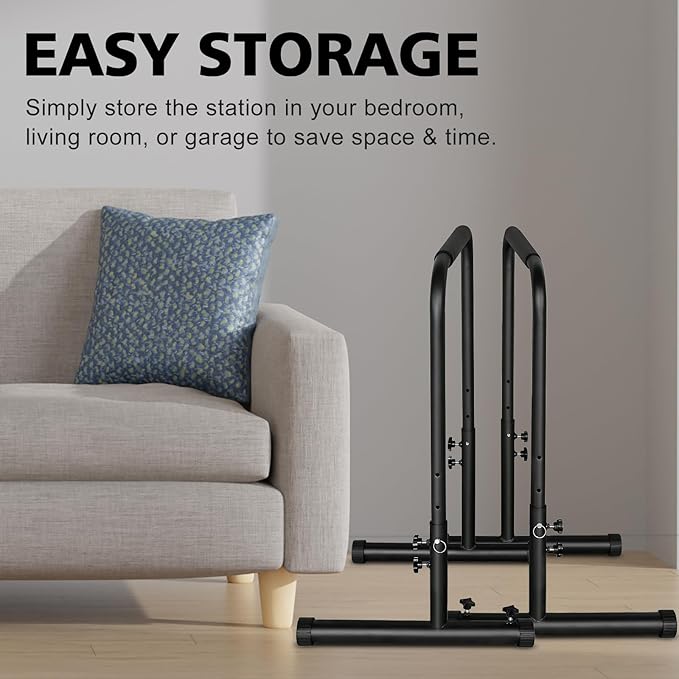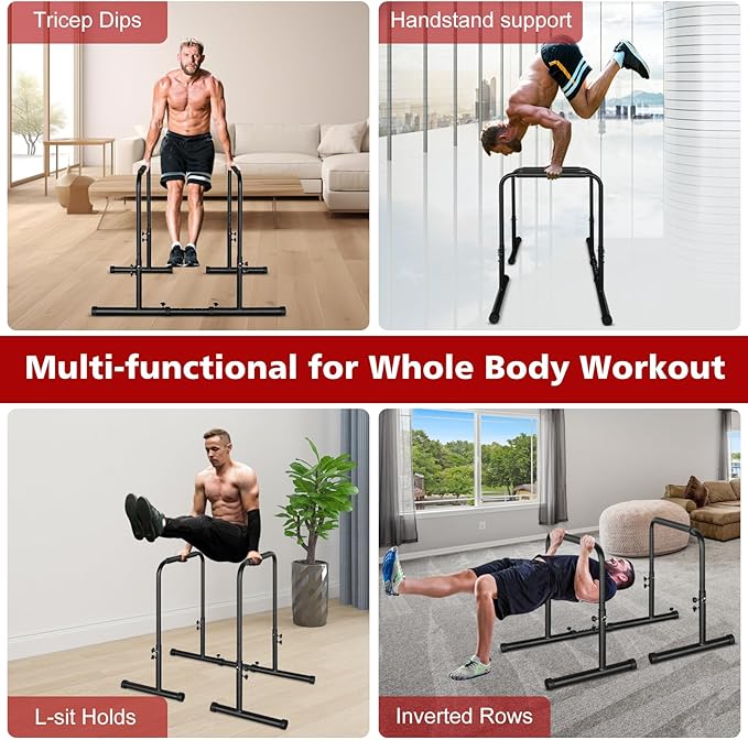 - 【Sturdy Construction】Our heavy duty steel construction Dip stands is made of high-quality steel pipes, which has 350LBS weight capacity and double safety connector. Non-slip and wear-resistant rubber feet for firm positioning to keep you safe, prevent slipping and wobbling while preventing damage to the floor.