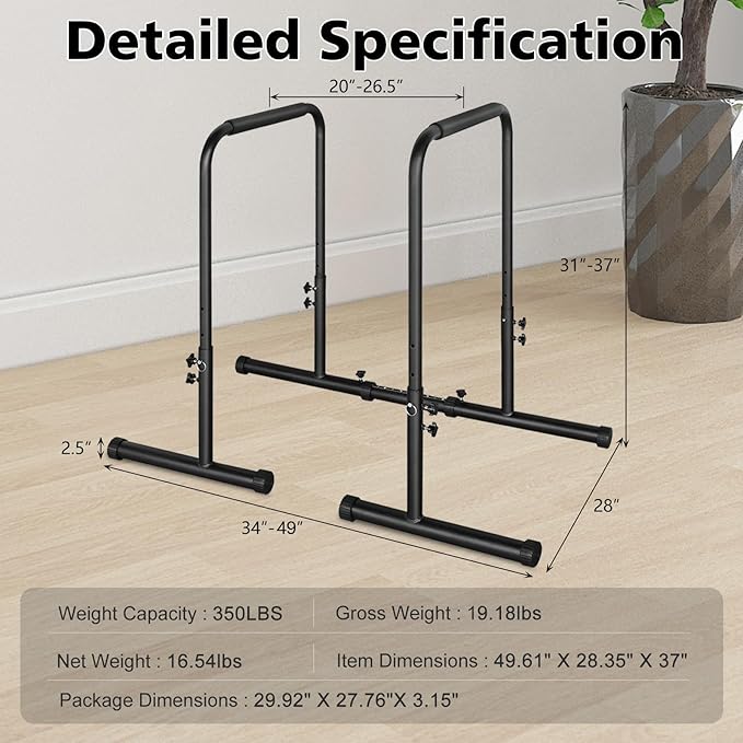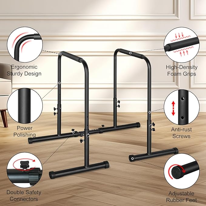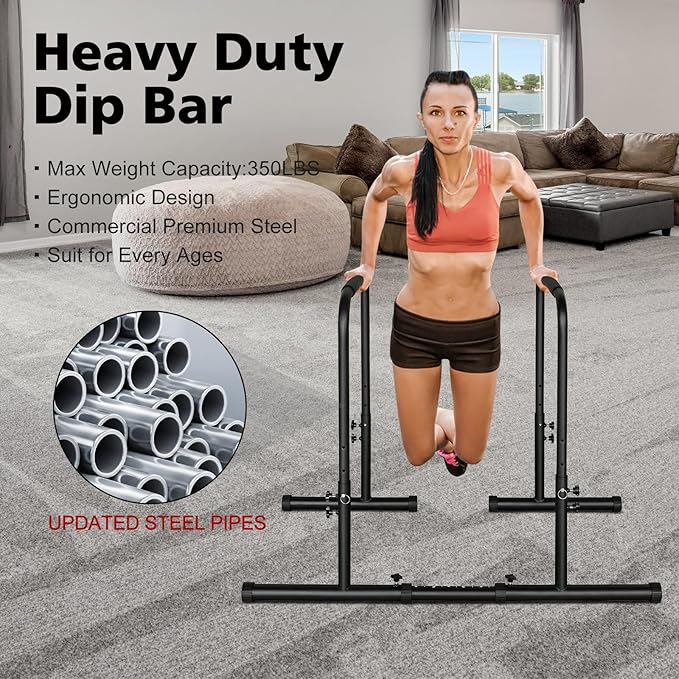 - 【Sturdy Construction】Our heavy duty steel construction Dip stands is made of high-quality steel pipes, which has 350LBS weight capacity and double safety connector. Non-slip and wear-resistant rubber feet for firm positioning to keep you safe, prevent slipping and wobbling while preventing damage to the floor.