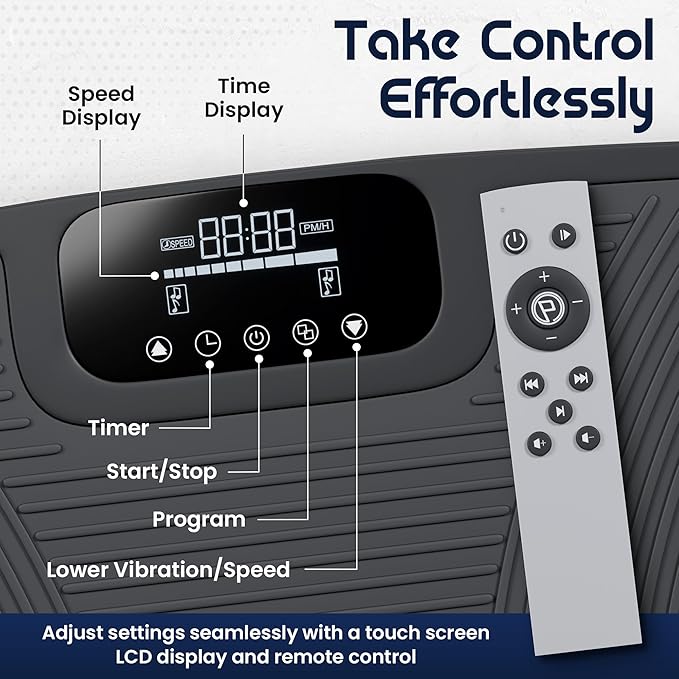 - SWIFTLY ALTER THE SETTINGS of your vibration board exercise machine using the touch screen LCD or remote control. No confusion here—our vibration platform machines have clear displays, making it easy to track time, speed, and progress in real-time