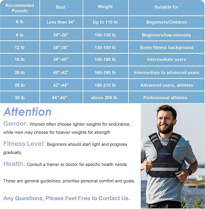 - DURABLE & COMFORTABLE: Our adjustable weight vest is made of special soft and sweat-proof neoprene comfortable material, so it is very suitable for any type of aerobic exercise and weight training