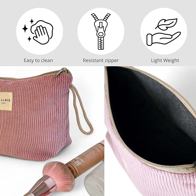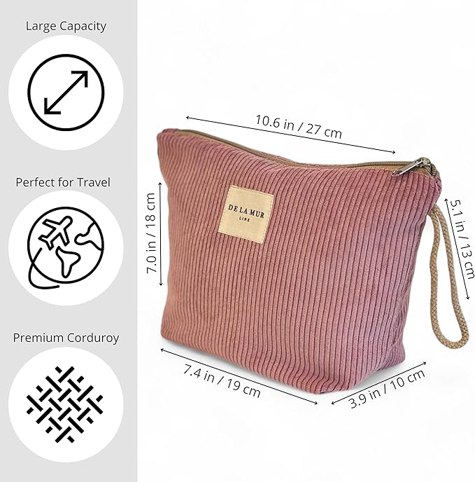 - SOFT & LUXURIOUS PINK CORDUROY FABRIC Crafted from premium soft corduroy, this elegant cosmetic bag for women blends style and durability. Its blush tone adds a fashionable touch to your travel accessories and everyday organization.