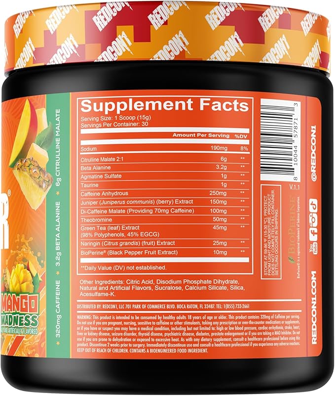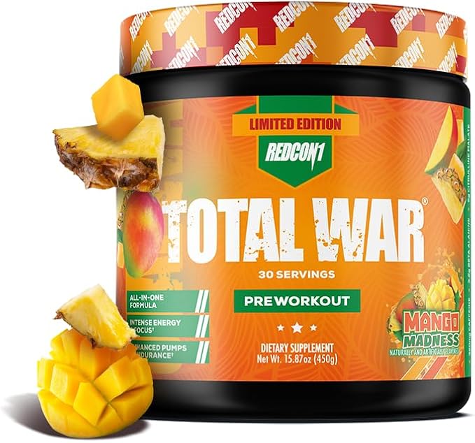 REDCON1 Total War Pre Workout Powder, Mango Madness - Fast Acting Caffeinated Preworkout for Men + Women with Beta Alanine - Contains Citrulline Malate for Increased Pump, Blood Flow (30 Servings)