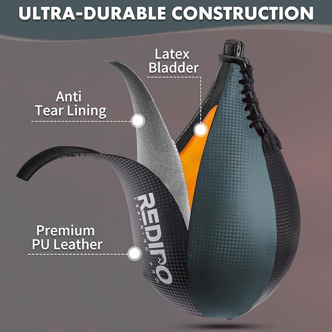 - 【Premium Boxing Equipment】--PU leather and heavy-duty latex bladder, reinforced nylon webbing, sturdy and durable, professional pear-shaped balance design for precise bouncing, hidden inflation holes to effectively prevent air leakage.