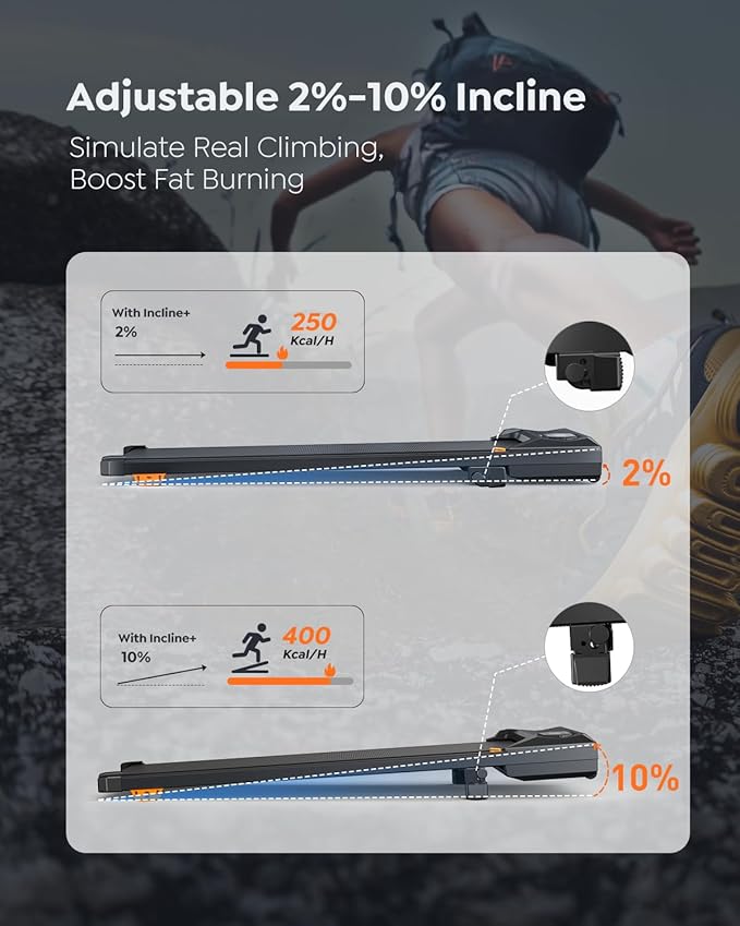 - 【10% Manual Incline】 Walking pad with incline switch to a 10% incline in just 2s to simulate hill climbing, helping you burn more calories. Whether you’re working from home or managing emails at the office, this feature lets you boost your workout without interrupting your day.