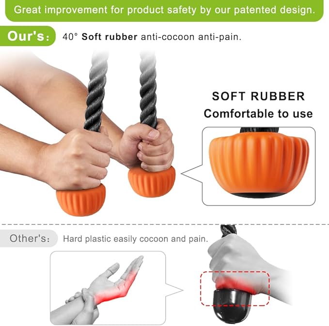 - 【28-inch Tricep Rope】The tricep rope features soft rubber on both ends to prevent hand slippage, providing a comfortable feel for working out triceps, biceps, back, abs, and improving grip strength.