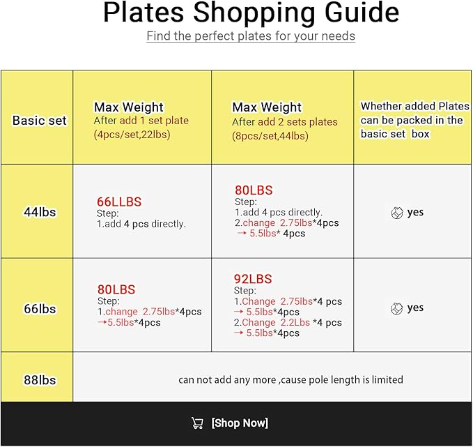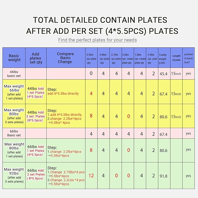 - 【Basic 66lbs】add 1 set plate (4pcs/set,22lbs) ---Max weight 80lbs. add 2 sets plate (8pcs/set,44lbs) ----Max Weight 92lbs. CAN HOLD PLATES IN 66LBS CASE