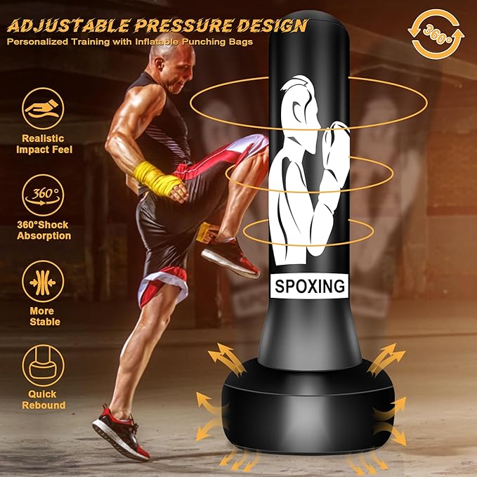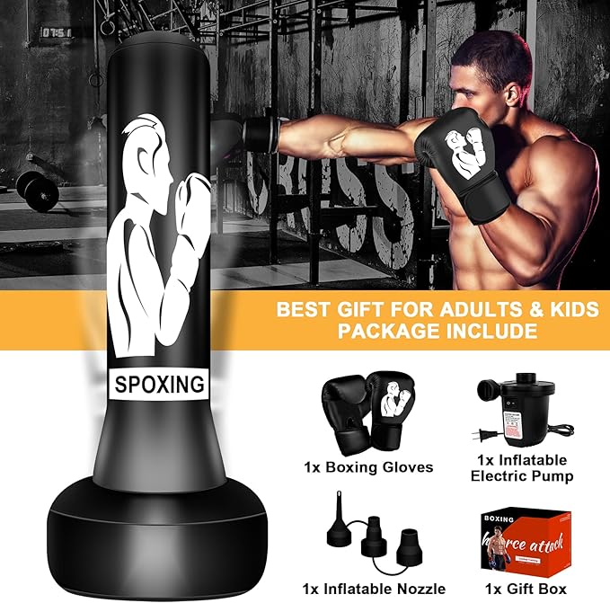 - Professional Boxing Punching Bag Set: With our equipment, you will get a complete set of boxing training tools: a stand-alone punching bag, a pair of boxing gloves and an electric air pump, everything you need. No need to buy an extra air pump, it is easy to inflate, saving you time and energy. Our gloves are designed to provide top-level protection for your hands, allowing you to punch with confidence