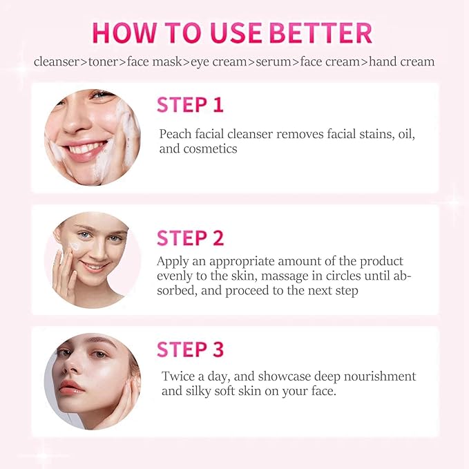 - 【Skin Care Set For Women】: The peach facial kit for women can replenish moisture to the skin, achieving long-term hydration effects, making the skin plump and soft, and helping to solve the 5 early look of skin dehydration: greasy, dry, wrinkled, cracked, and rough