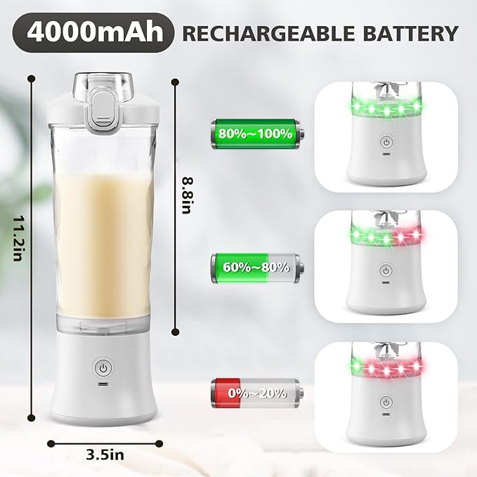 - Portable Design: This on the go blender has a built-in 4000mAh battery and supports USB charging, making it convenient to charge anywhere. This mini portable blender for smoothies and shakes features a lightweight design, making it perfect for travel, the gym, and the office. It's easy to carry and fits in backpacks, gym bags, or car cup holders.