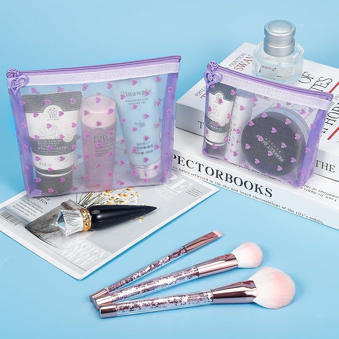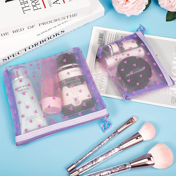 6 Pack Mini Zipper Mesh Makeup Bags, Heart Print Nylon Cosmetic Bags Toiletry Bags for Office Travel Organization (Widened-Purple, S)