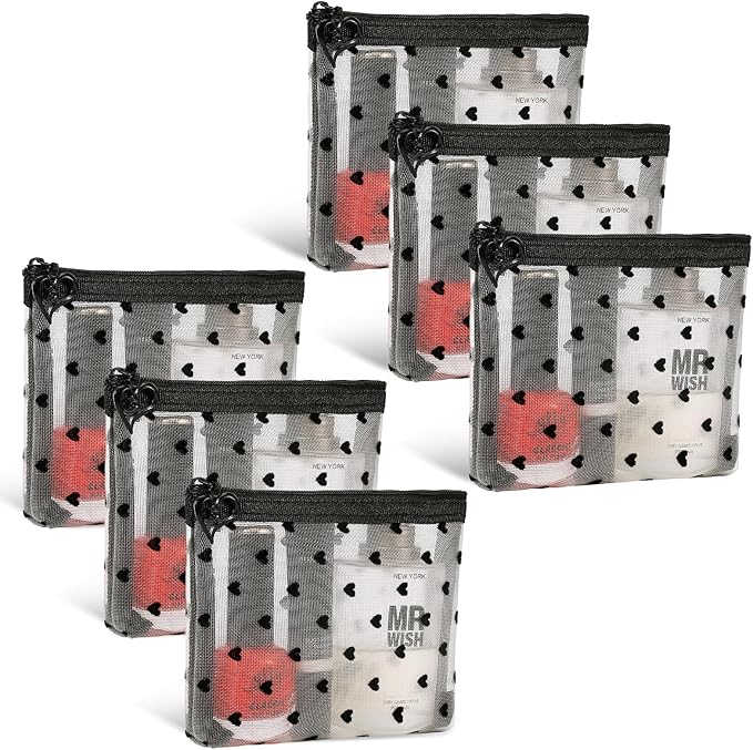 6 Pack Mini Zipper Mesh Makeup Bags, Heart Print Nylon Cosmetic Bags Toiletry Bags for Office Travel Organization (Widened-Beige, XS)