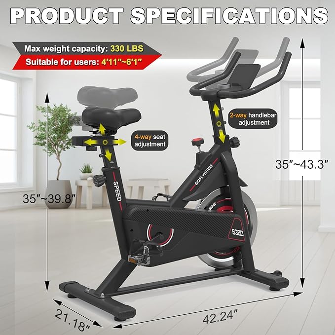 - đ´ăCOMFORTABLE SEATINGă Our indoor cycling bike comes with fully adjustable handlebars and built in arm and elbow rests. At the same time equipped with adjustable height seat. The bike features a well-cushioned seat, designed to provide optimal comfort during extended cycling sessions.