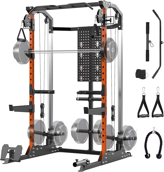 - 【What’s in the Package】: Power Cage with Cable Crossover System *1; Lat Pulldown Curl Bar *1; Lat Pulldown Bar *1; Landmine Handle *1; Strap Handle *1; Nylon Braided Tricep Rope *1; Ankle Strap *1; Clips *8; Hanging Board *1; Hooks *8.