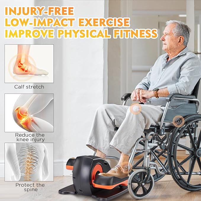 - LOW-IMPACT& ZERO PRESSURE - Low-Intensity Exercise under the desk elliptical is especially suitable for the elderly and people who have leg rehabilitation. Helping burn calories, improve cardiovascular health, and promote faster leg recovery. Say goodbye to boring workouts!(Note: Remote control requires a battery, not included due to shipping restrictions.)
